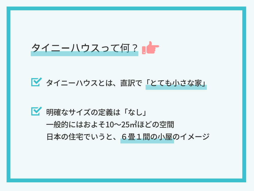 タイニーハウス(Tiny House)とは、その名の通り「とても小さな家」のこと。英語で「小さい」といえば “small” を思い浮かべる人も多いかもしれませんが、“tiny” はそれよりもさらに小さなニュアンスを持ちます。